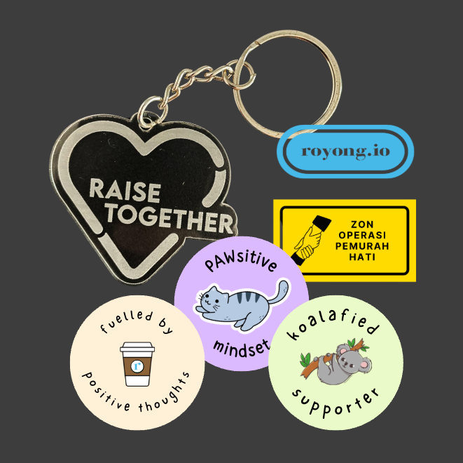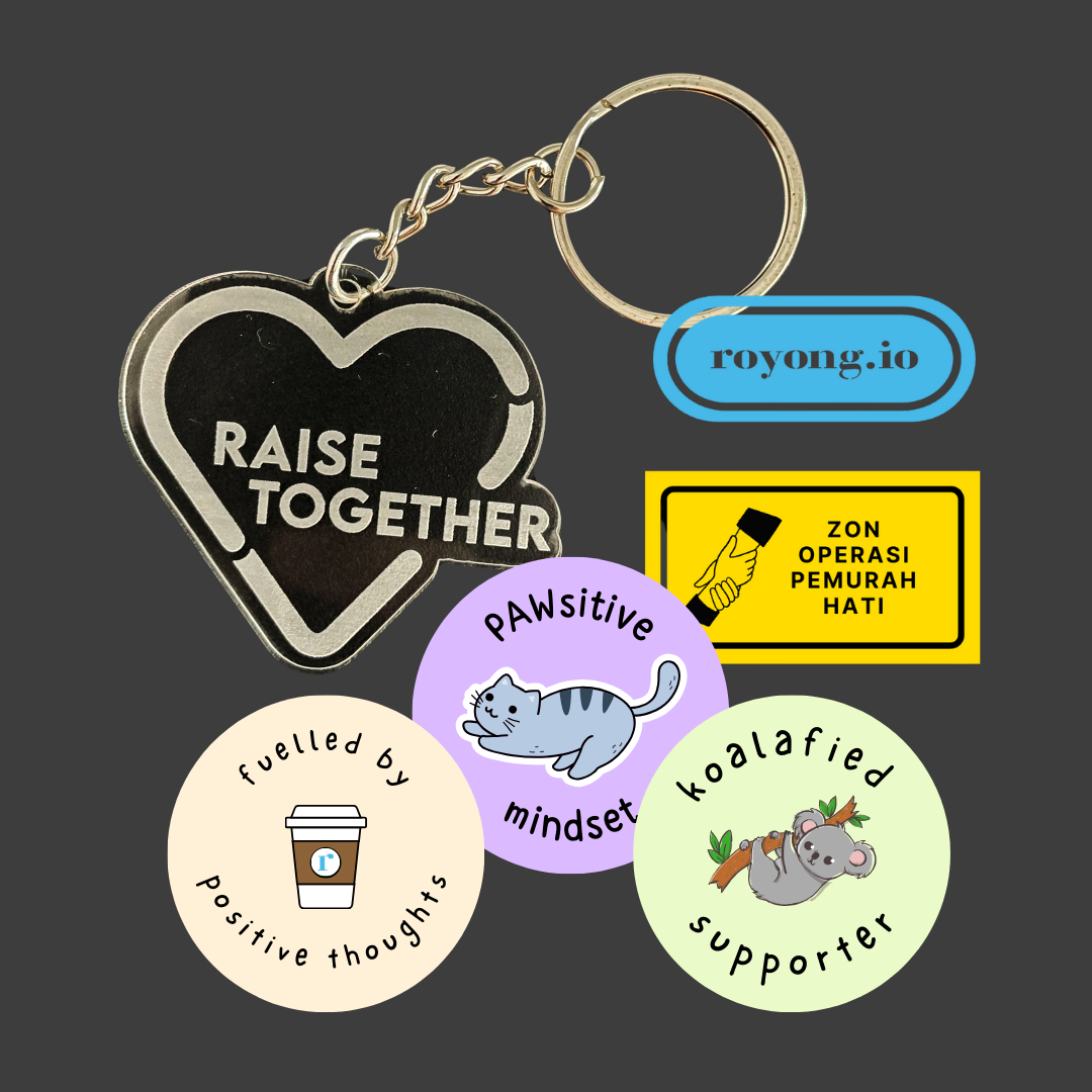 This sticker pack includes: Royong.io logo stickers, "Zon operasi pemurah hati" sticker, "Kindness & Positivity" sticker and "Pawsitive Mindset" sticker.